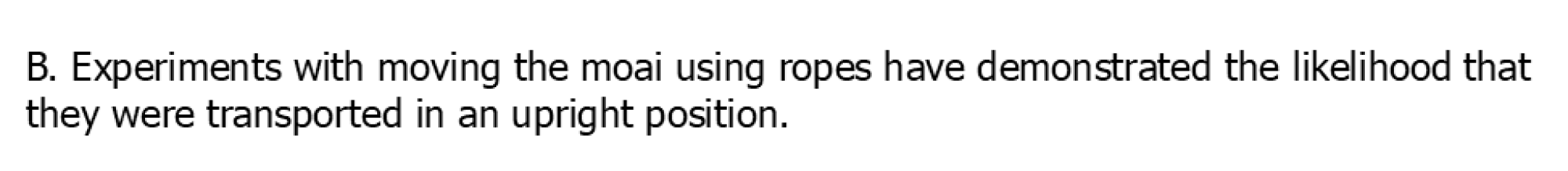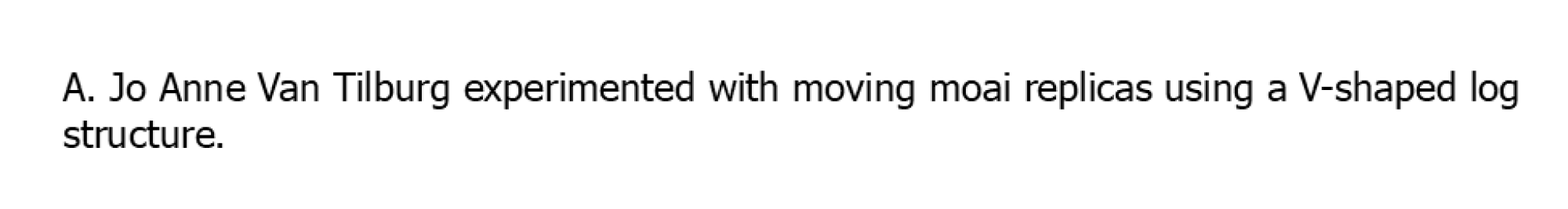 that rolling prone statues was the most efficient method. As further evidence, Van Tilburg oversaw the movement of a moai replica by the method she had proposed.