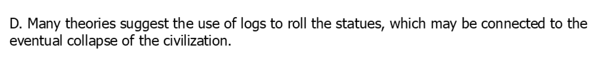 logs facilitate the movement of the statues? Most proponents of this method believe that the people created “rollers” by arranging parallel logs on which the prone